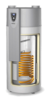está compuesta de un acumulador de 200 o 300 litros con una pequeña bomba de calor integrada en la cabeza del acumulador, que extrae energía del aire de su ambiente.